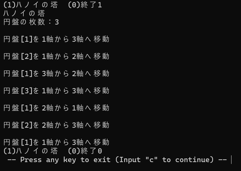 printf("(1)ハノイの塔 (0)終了");